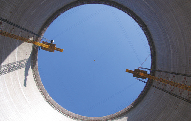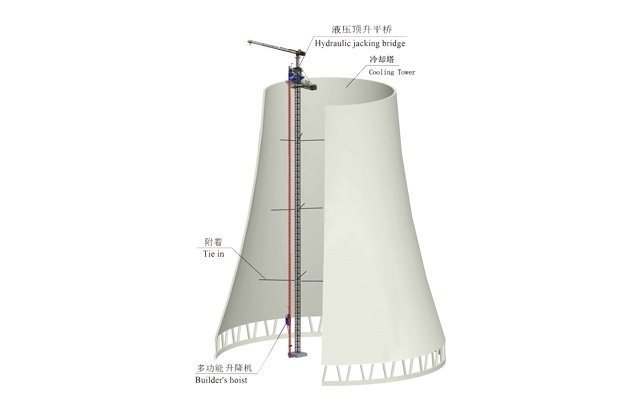 該機是冷卻塔施工的專用設備,與升降機配合使用,頂部塔機可以吊運鋼筋,塔身為升降機提供附著支撐,水平吊橋為施工人員和物料提供平臺。